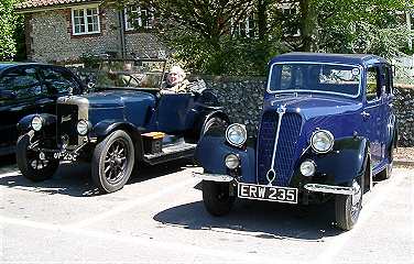 Left: the Sparrow/Dixon vintage Jowett (Betty Davis in the passenger seat) and Richard Keil's purple 8HP Jowett saloon car